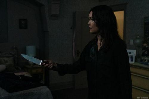 艾米丽从暗处走出,手中紧握着刀。她一步步逼近养父,眼神坚定,仿佛已经做好了决定。